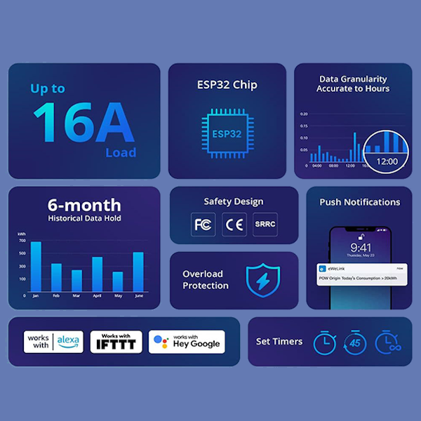 Suivi de la puissance, du courant, de la tension et de la consommation électrique cumulée de vos appareils en temps réel sur l'écran LCD. Prend en charge une charge maximale de 16A, POW Elite compatible avec plus d'appareils électroménagers. Les données de consommation d'énergie (précises en heures) peuvent être conservées jusqu'à 6 mois et peuvent être exportées vers Excel sur votre téléphone. Vous pouvez définir le seuil de puissance, de courant et de tension. Une fois qu'une condition est remplie, le POW Elite sera éteint pour protéger vos appareils. POW Elite possède toutes les fonctions les plus élémentaires, telles que le contrôle des applications, le contrôle vocal, le contrôle LAN, le calendrier, le réglage progressif, l'état de mise sous tension, etc.